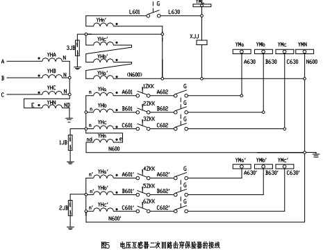⑸電壓互感器中性點引出線上,一般不裝設熔斷器或自動開關。采用B相接地時,其熔斷器或自動開關應裝設在電壓互感器B相的二次繞組引出端與接地之間。